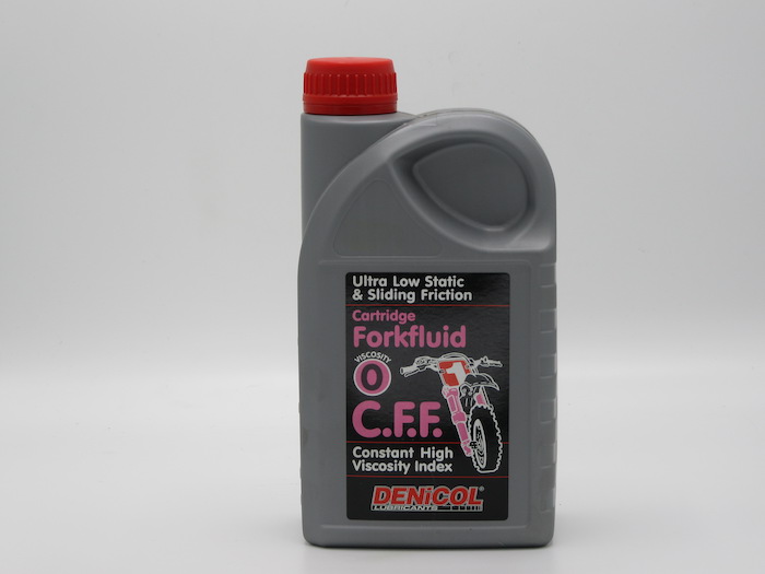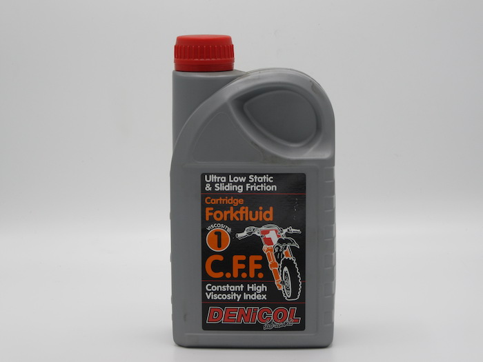 1 liter voorvorkolie van het merk Denicol. Verkrijgbaar in viscositeit 0 (SAE 5) en viscositeit 1 (SAE 7,5).